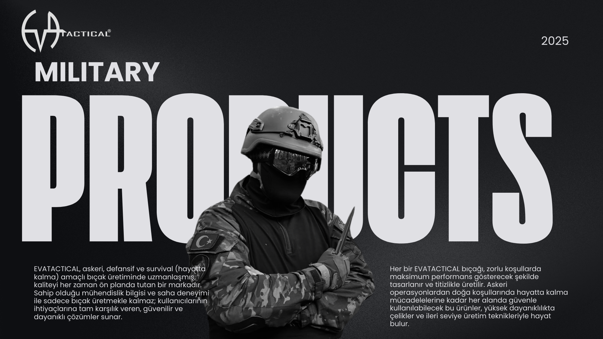 EVATACTICAL olarak, yalnızca bıçak üretmiyoruz; sahada görev yapan her kahraman için güven üretiyoruz. Bizim için her ürün, bir kesici alet değil, zor koşullarda görev yapan personelin ihtiyaçlarına verilen somut bir cevaptır.